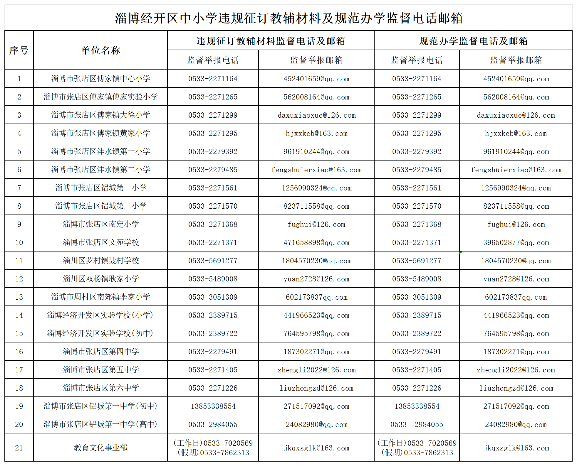 关于公布淄博经开区中小学违规征订教辅材料及规范办学监督举报电话和邮箱的公告
